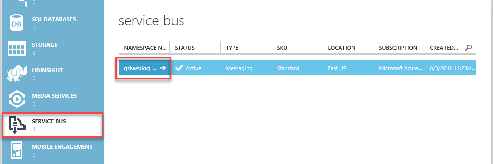 When deployed, go to Service Bus. (Note the namespace – we are going to need this later). Click on the namespace.